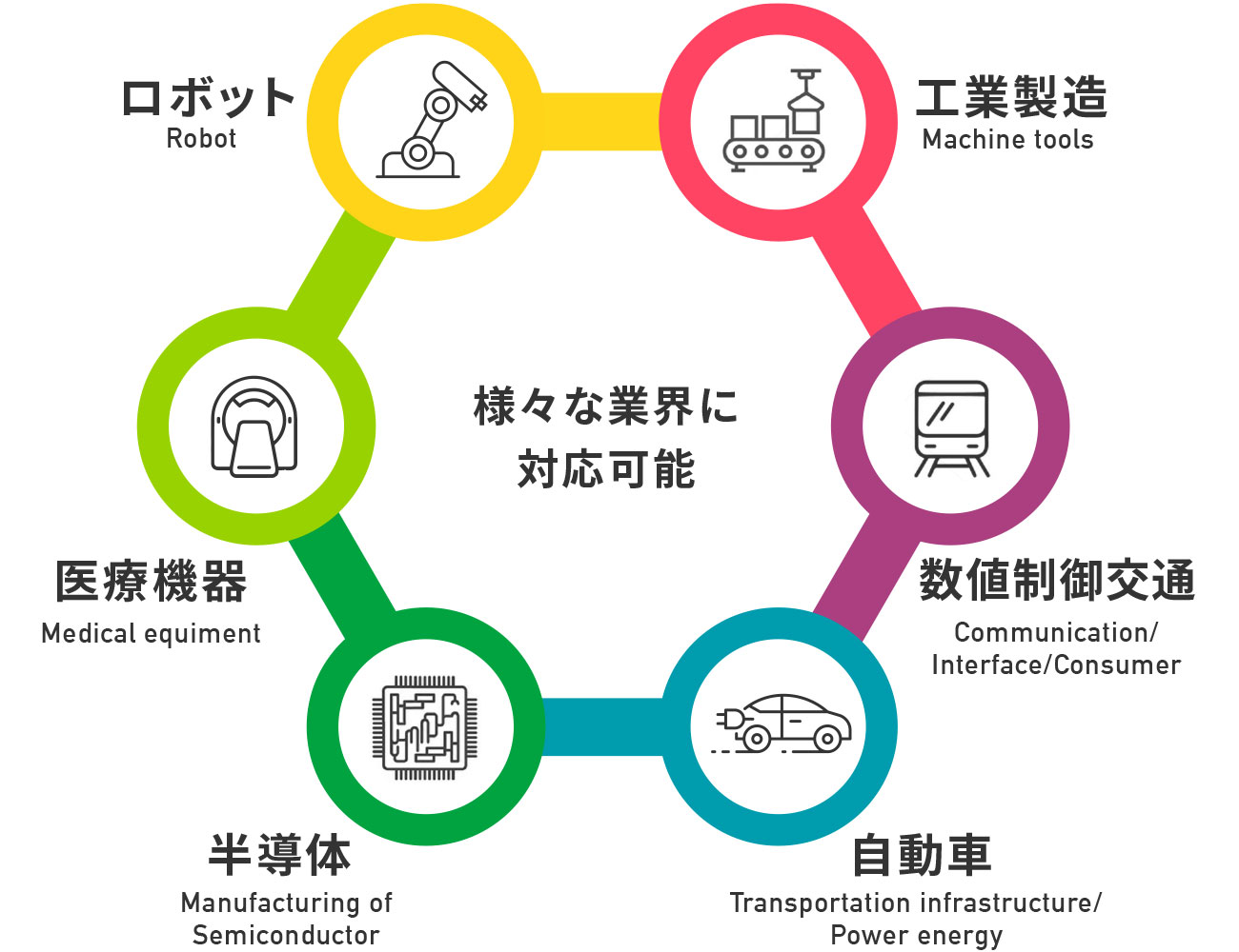 高速移動、各種業界認証、海外規格、産業制御、サーボ動力、産業用ビジョン、電源、通信LANケーブルなど、多様なケーブルを網羅し、各産業の高性能ケーブルに対するニーズを満たします。